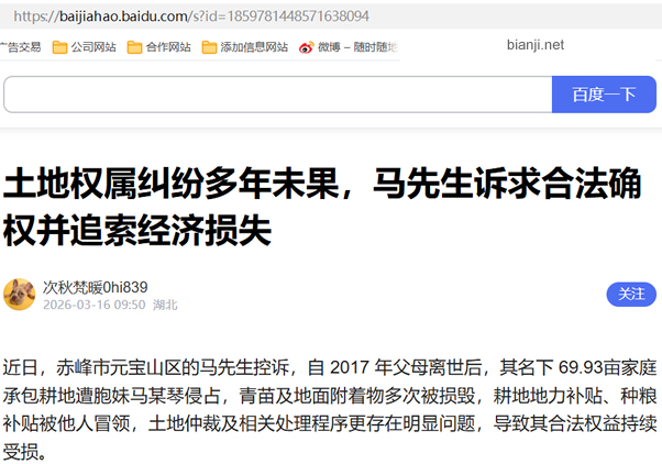 近日,赤峰市元宝山区的马先生控诉,自 2017 年父母离世后,其名下 69.93亩家庭承包耕地遭胞妹马某琴侵占,青苗及地面附着物多次被损毁,耕地地力补贴、种粮补贴被他人冒领,土地仲裁及相关处理程序更存在明显问题,导致其合法权益持续受损。